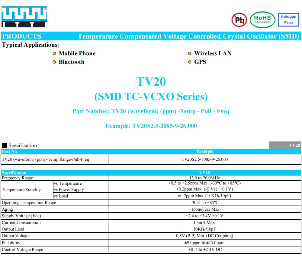 TC-VCXO振荡器,TV20S2.5-3085-9-18.000,ITTI低功耗6G晶振 参数表