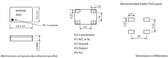 符合RoHS,在宽温度范围内具有紧密的稳定性,5.0毫米x 3.2毫米x 1.2毫米