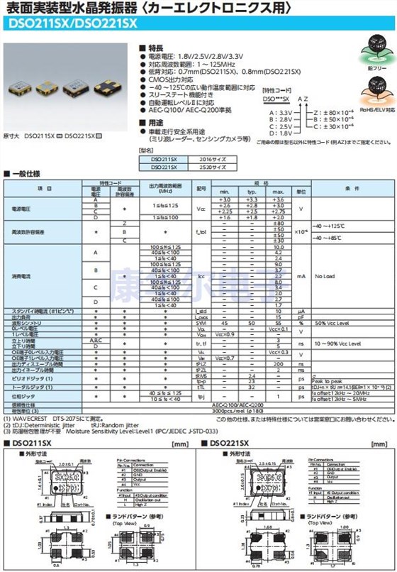 日本KDS晶振DSO221SX型号2520尺寸;电源电压:1.8V/2.5V/2.8V/3.3V;可用频率范围:1 至 125MHz;扁平:0.8mm;CMOS 电平输出;能够在 -40°C 至 125°C 的宽温度范围内工作;3 态函数;符合 II 级自动驾驶;符合 AEC-Q100/AEC-Q200 标准。7FE02496A00是2520贴片晶振,KDS有源晶振,车载晶振。