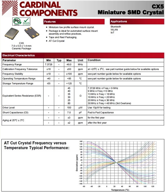 | CX5Z-A5B2C5-70-7.37280D18 | Cardinal晶振 | CX5 | 7.3728MHz | ±50ppm |